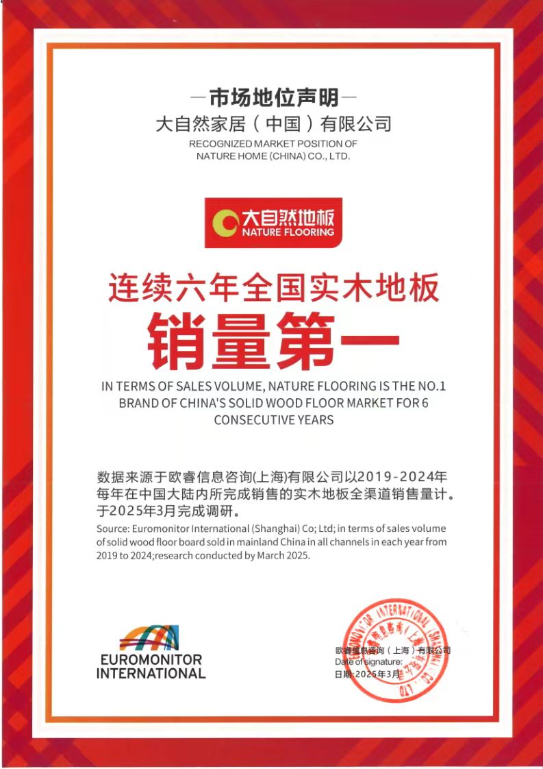 根據(jù)市場(chǎng)權(quán)威數(shù)據(jù)印證了這一戰(zhàn)略成效:歐睿國(guó)際2024年度報(bào)告顯示,大自然實(shí)木地板連續(xù)6年(2019-2024)榮膺“全國(guó)實(shí)木地板銷量第一”和“全球?qū)嵞镜匕邃N量第一”的榮譽(yù),這一成就詮釋了商業(yè)價(jià)值與生態(tài)價(jià)值協(xié)同共生的典范。