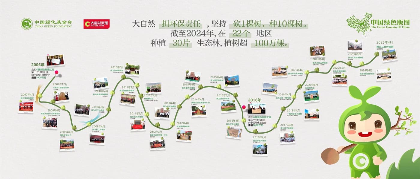 自“中國(guó)綠色版圖”工程啟動(dòng)以來(lái),大自然家居董事長(zhǎng)佘學(xué)彬提出的“砍一棵樹(shù),種10棵樹(shù)”理念在20年間持續(xù)踐行,以長(zhǎng)期堅(jiān)守為指引,積極推動(dòng)行業(yè)走向商業(yè)向善的可持續(xù)發(fā)展道路,并帶動(dòng)更多人加入守護(hù)環(huán)境、共創(chuàng)綠色未來(lái)的行列。