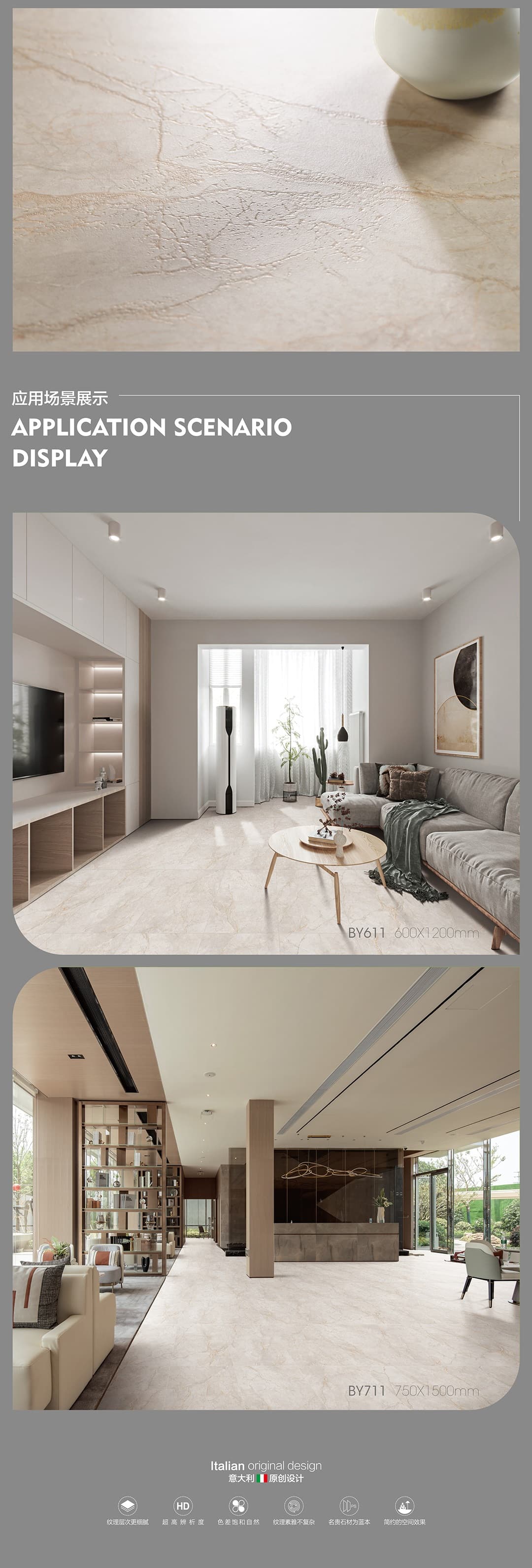 產(chǎn)品特性 表面柔和,防污效果強,防滑R10指標(biāo)高,抗折強度好
